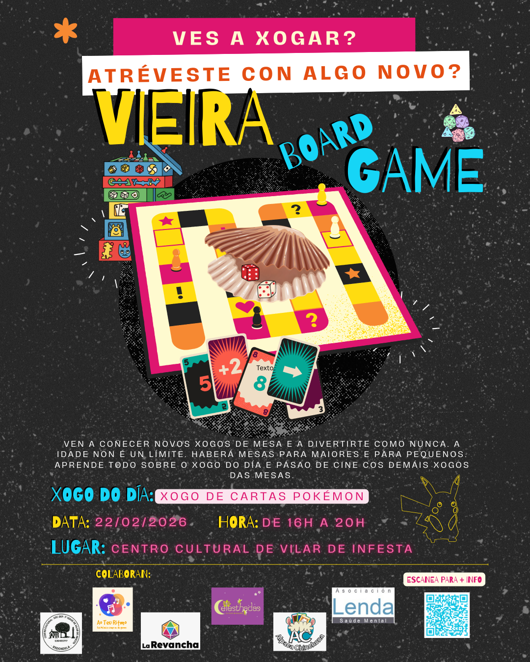 Ao Teu Ritmo súmase a colaborar na tarde de Vieira Board Game, un espazo ideal para reunirse e gozar xogando. Este evento é perfecto para todos os amantes dos xogos de mesa, xa que o xogo do día será o popular Xogo de Cartas Pokémon. Ademáis, haberá unha selección de outros xogos de mesa multixogador para que poidas pasalo ben e compartir un bo rato cos teus amigos e familiares. Non importa se eres principiante ou experto, ou a idade que teñas, xa que haberá mesas para todos os gustos, dificultades e idades. Vén e pasa unha tarde divertida e chea de risas, estratexia e boa compañía.